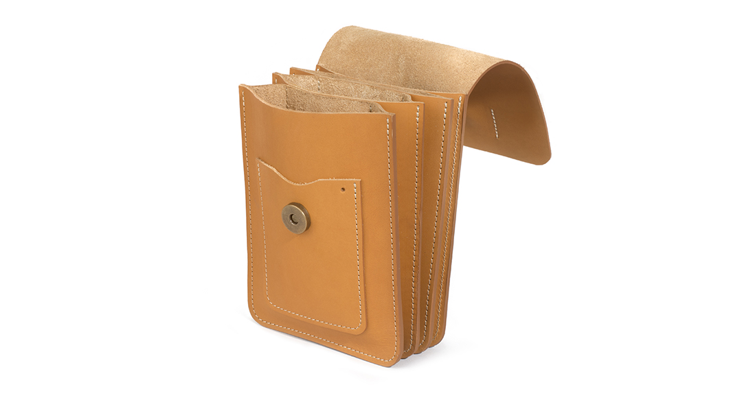 Un fourreau et un porte-bobine en cuir tanné végétal viennent s’associer au sac de Bijoutier. Pinces, limes et fils de métal précieux ont trouvé leur place dans ce petit sac à soufflets et dans les accessoires qui le complètent.